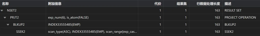 没有标题栏,每部分内容不知含义,如方括号中一串数字有操作符部分,但只看名称部分勉强能猜出来,有的完全猜不出操作符后面应该是每种操作符的参数,操作符不同参数而已,各参数还有输入值等整体缩进式结构,应该跟其他数据库类似,可反应操作符执行顺序达梦也有其他图形化工具,情况会好一些。如在达梦最近推出的SQLark百灵中,通过分栏显示清晰了很多,当然还是存在不知含义等问题。