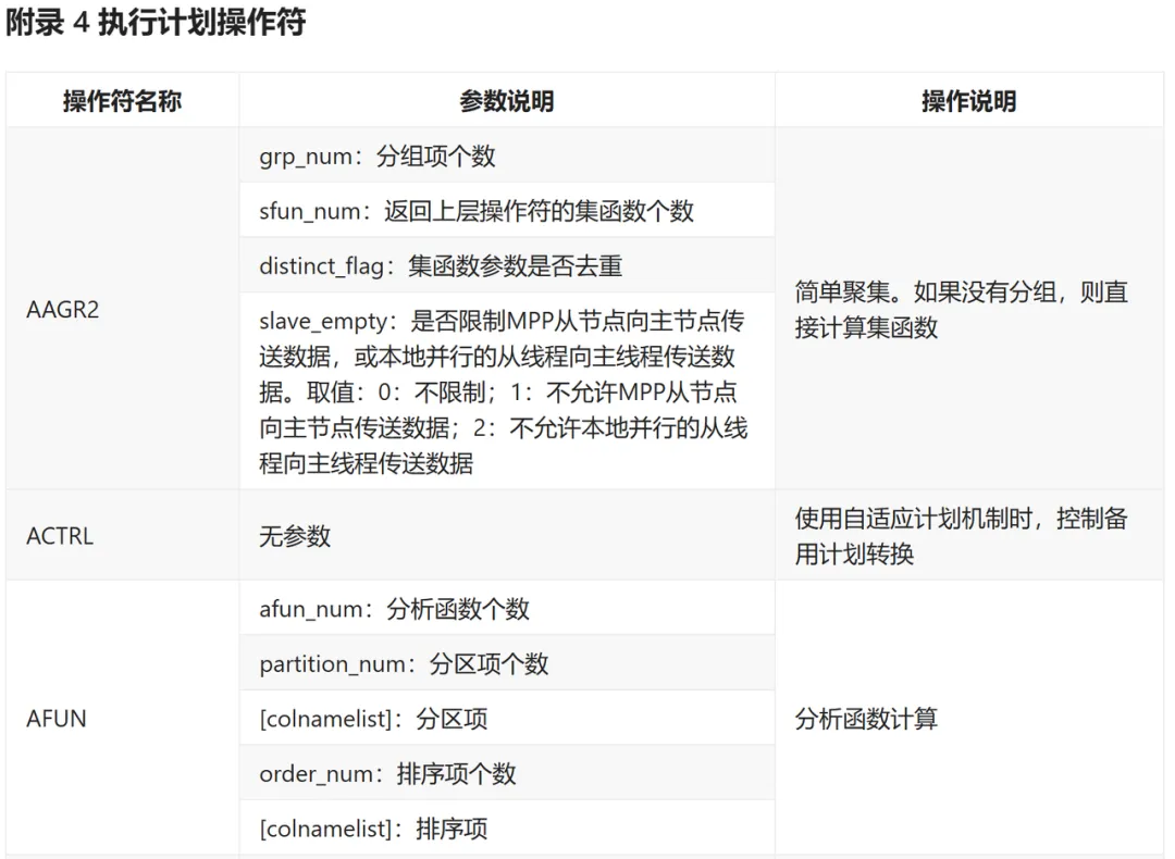 于是,只能借助达梦文档,来回查看操作符含义、参数含义等等。如下图是达梦官方提供的执行计划操作文档,写的还是挺清楚的。当然,往复切换查看文档和执行计划的过程还是令人不悦,是不是能有更好的一些方法呢...