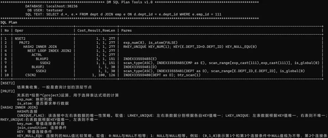 首先,第一个问题就是搞环境,开始以为很简单的事。用Docker起了个达梦实例,然后在本地装Python连达梦库。之前用cx_Oracle、MySQLdb、PyMySQL连接Oracle、MySQL都是很简单,但参照达梦官方文档使用Python连接,遇到了一堆的问题;前后试了一小时,放弃...选择用比较挫的方式,直接程序中调用达梦DiSQL命令行工具方式。然后,就是如何将达梦的知识库(执行计划操作符含义)与程序产生互动。达梦的官方文档不错,写了个简单的爬虫将信息导出,存储在程序中作为元信息使用;剩下就是做些字符串处理,规格化一下。第三,就是字符终端输出,这个有点基础调用现成包就可以。于是有了下面这个小原型。