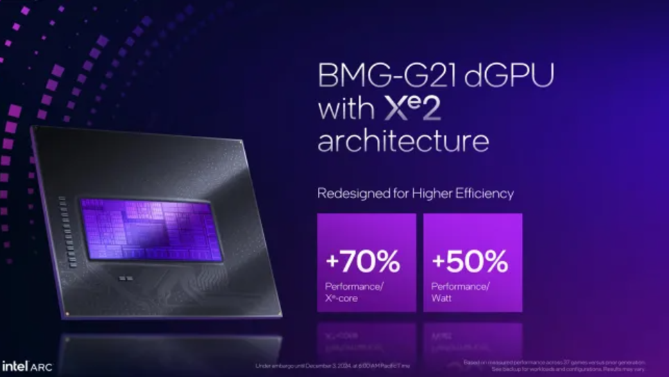 英特尔称,首批“战斗魔法师”显卡配备了BMG-G21 GPU,拥有20个Xe核心、160个XMX引擎、20个光线追踪单元、192位GDDR6显存接口以及其他升级。英特尔宣称,每个Xe核心的性能提升了高达70%,每瓦性能提升了高达50%。