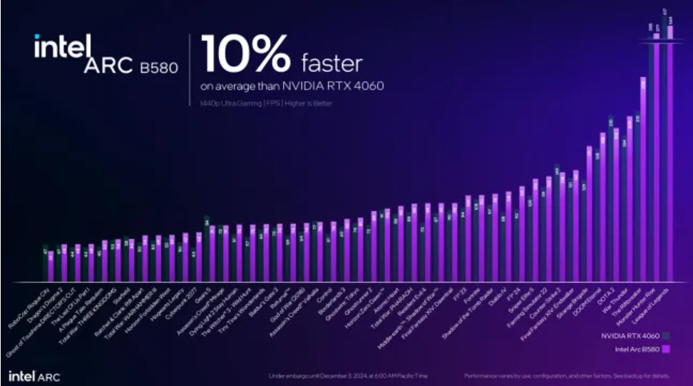 但即便如此,根据其Windows基准测试结果显示,B580的性能比Intel Arc A750 快 24%。同时在与 NVIDIA 的竞争中,他们宣称在 Windows 系统下,Arc B580 的性能比 NVIDIA GeForce RTX 4060 快 10% 。