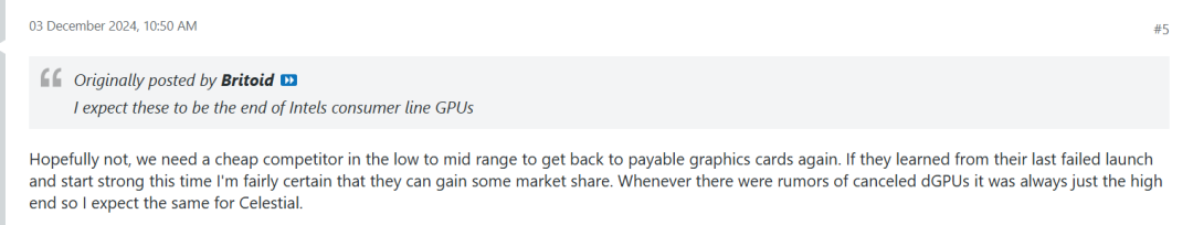 “每当有传言说独立显卡(dGPU)被取消时,通常都只是针对高端市场,所以我预计Celestial(可能指某款Intel显卡)也会是同样的情况。”