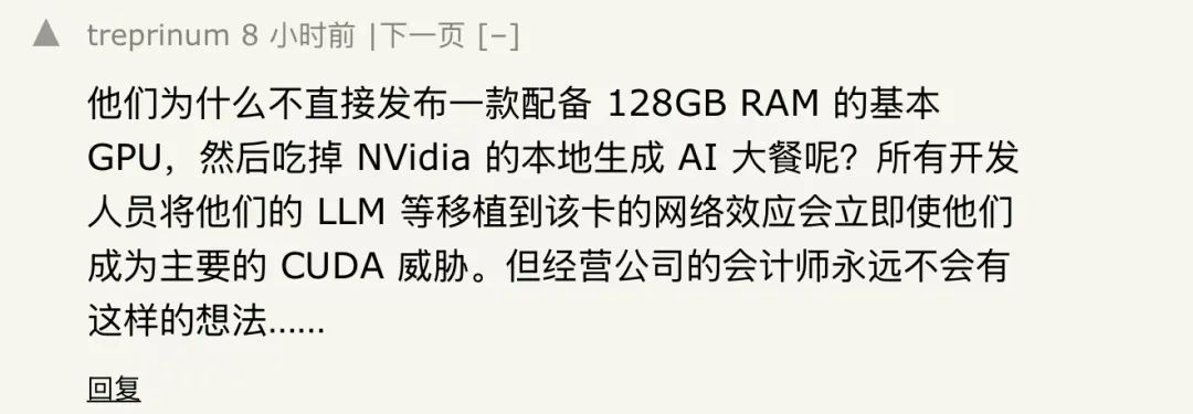 甚至有网友希望英特尔直接发布一款配备128GB RAM的GPU,在本地部署GenAI领域吃掉Nvidia的份额,一旦开发者们移植LLM到新的GPU,就会给CUDA造成威胁。