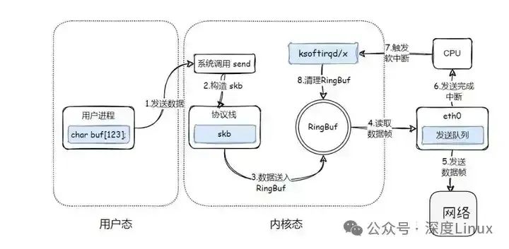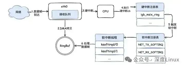 当网卡接收到报文时,这场 “入境之旅” 就开启了。首先,网卡通过 DMA(直接内存访问)技术,以极高的效率将数据包拷贝到 RingBuf(环形缓冲区)中,就好比货物被快速卸到了一个临时仓库。紧接着,网卡向 CPU 发起一个硬中断,就像吹响了紧急集合哨,通知 CPU 有数据抵达 “国门”。