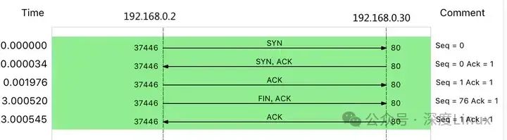 前三个包是正常的 TCP 三次握手,这没问题;但第四个包却是在 3 秒以后了,并且还是客户端(VM2)发送过来的 FIN 包,说明客户端的连接关闭了根据 curl 设置的 3 秒超时选项,你应该能猜到,这是因为 curl 命令超时后退出了。用 Wireshark 的 Flow Graph 来表示,你可以更清楚地看到上面这个问题:
