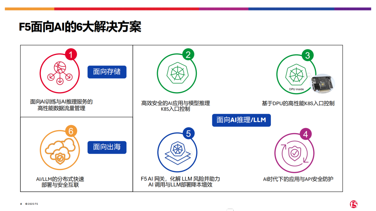 而在 ADC for AI 层面,F5 推出了六大创新解决方案,全面赋能 AI 应用的推理、训练及部署过程。