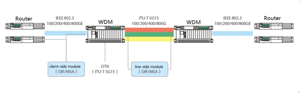 光传输客户设备输出的100/200/400/800GE以太网接口规范由IEEE802.3定义。连接WDM设备和客户设备的客户侧光模块相关标准由OIF/MSA定义。WDM设备涉及到的业务信号封装和光传输系统,系统规范由ITU-T SG15定义,其中ITU-T SG15 Q5涉及光纤,Q6涉及WDM系统和光器件,Q11定义了OTN帧结构、映射,以及其他技术。线路侧光模块实现由OIF/MSA定义。