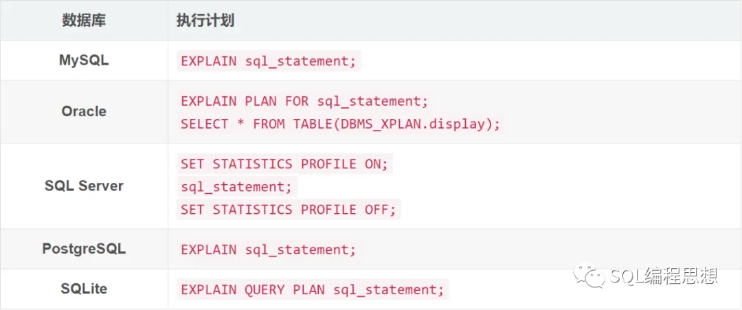 我们先给出在各种数据库中查看执行计划的一个简单汇总: