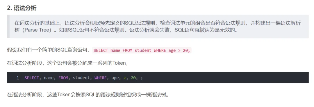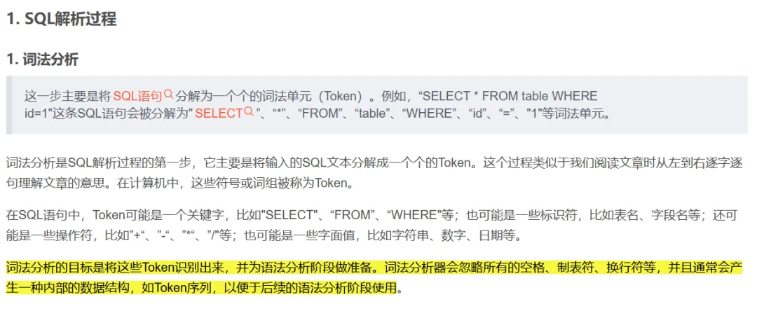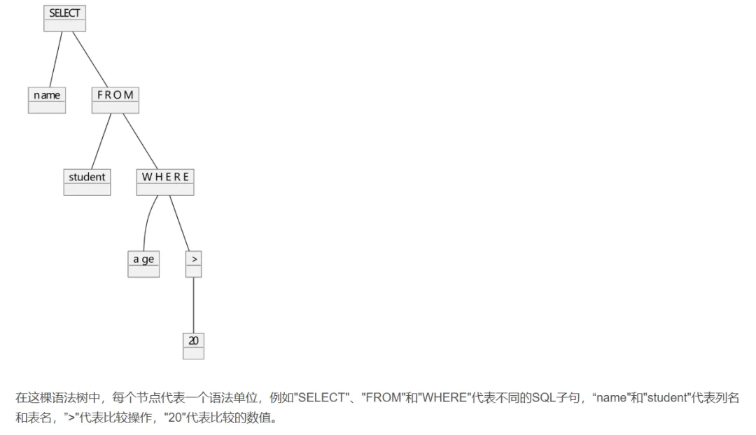 在执行某条SQL语句之前,MySQL需要先弄懂它的含义,所以需要解析器对 SQL 语句做解析。解析器首先会对SQL语句进行词法分析,也就是将SQL语句字符串中的关键字识别出来,比如select,from等等。接着解析器再根据词法分析的结果,对SQL语句进行语法分析构建出 SQL 语法树,方便后面模块获取 SQL 类型、表名、字段名、 where 条件等等。
