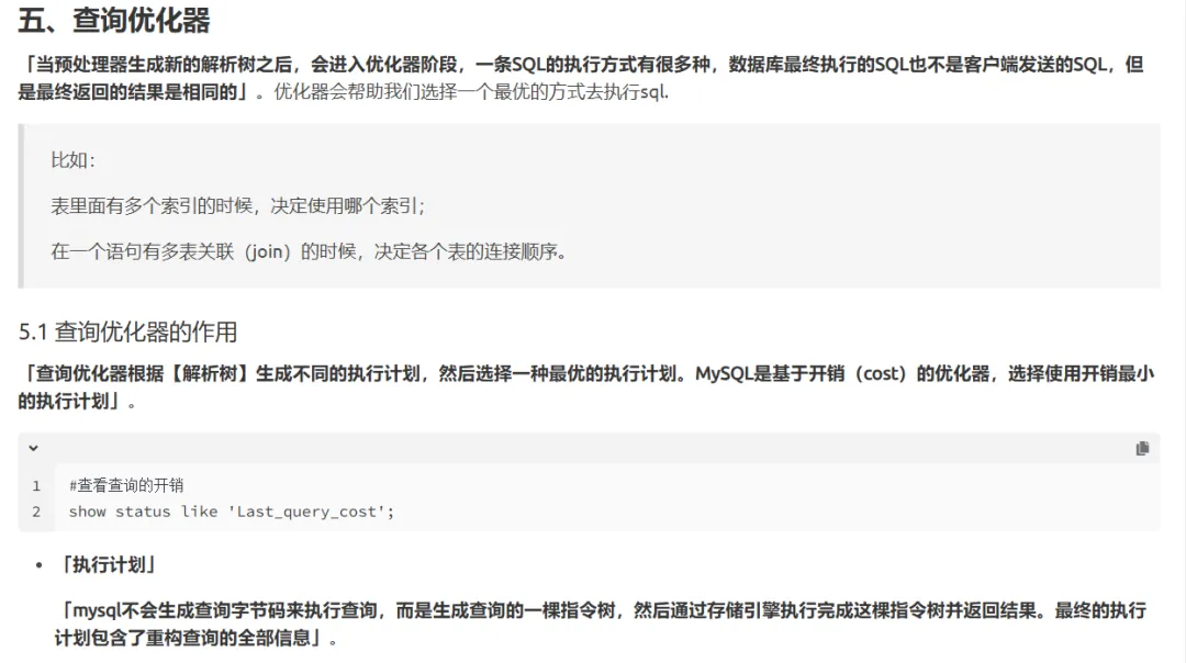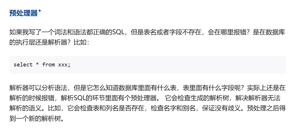 在正式执行SQL之前,还会经过预处理和优化两个阶段。预处理阶段,预处理器会检查 SQL 语句中的表或者字段是否存在。优化阶段,优化器负责将SQL语句的执行方案确定下来,比如在表里面有多个索引的时候,优化器会基于查询成本的考虑,来决定选择使用哪个索引。