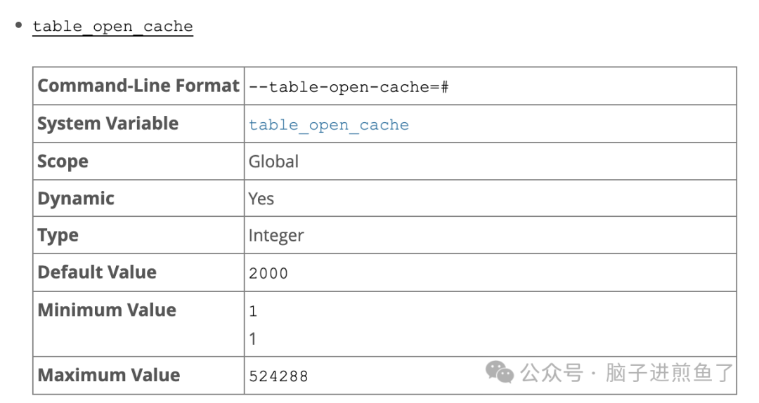 参考资料How MySQL Opens and Closes Tables:https://dev.mysql.com/doc/refman/5.7/en/table-cache.htmlTable_cache Class Reference:https://dev.mysql.com/doc/dev/mysql-server/8.4.3/classTable__cache.html#details