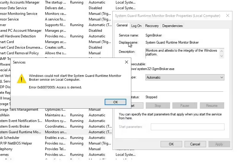 System Guard Runtime Monitoring Broker Service 无法启动,显示“访问被拒绝”错误(0x80070005)。微软澄清该服务处于休眠状态,将在未来更新中移除,目前可以忽略此错误,无需尝试启动该服务。