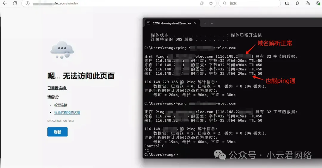背景介绍客户公司是一家做电商的企业,近期突然发现有几台电脑无法访问某个指定的服务网站,能正常解析该网站域名并且也能ping通,但就是打不开Web,提示“已重置连接”: