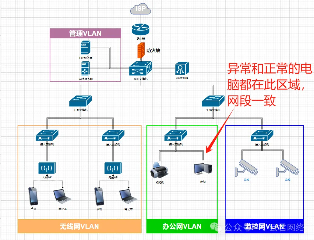 企业单位拓扑是典型的三层网络架构:路由—防火墙—核心—各个汇聚,经确认异常电脑和正常电脑所在的区域是一致的,都是办公VLAN,网段相同: