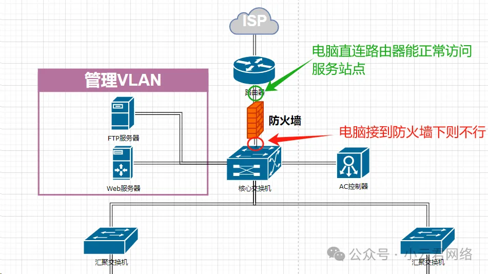 处理思路确认整体网络拓扑,异常的电脑和正常的电脑有哪些不同,是否不同VLAN等;将异常电脑接入不同的节点测试,看看是经过了核心、防火墙哪台设备才有问题。排障分析第一步:确认网络拓扑和异常电脑的位置