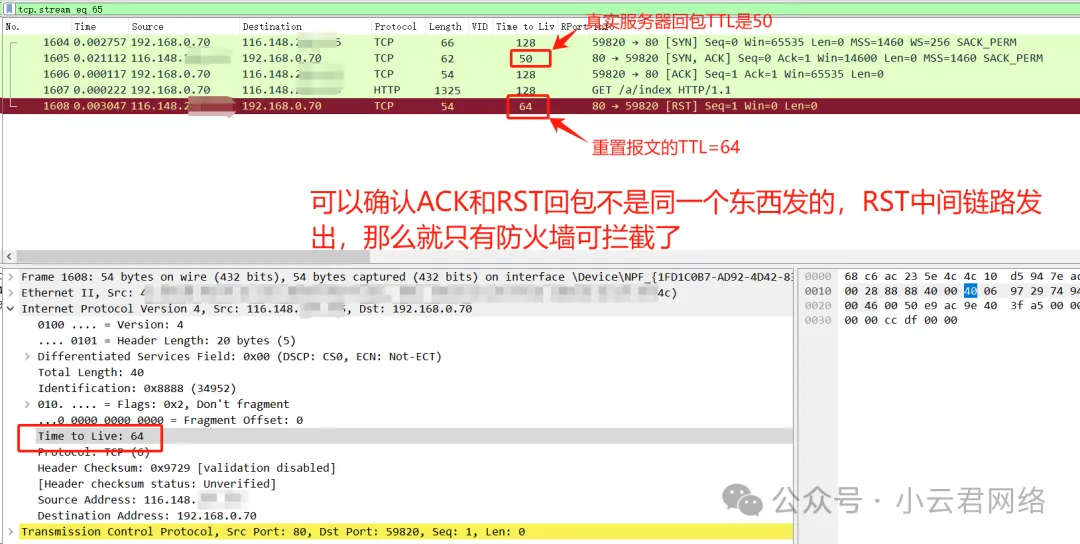是防火墙对上网流量进行了拦截,此时再回头分析之前的诊断,DNS域名解析和Ping都是正常的,但是访问时连接被“重置”了,说明是http/https的TCP流被阻断。这里抓个包,通过TTL值也可以进一步判断RST报文是中间链路发出的而不是服务器发出来的: