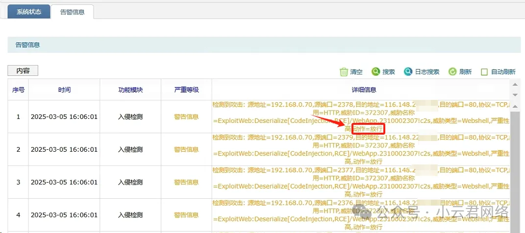 例外放行后,可以看到IPS模块还是会检测到异常,但是动作执行“放行”: