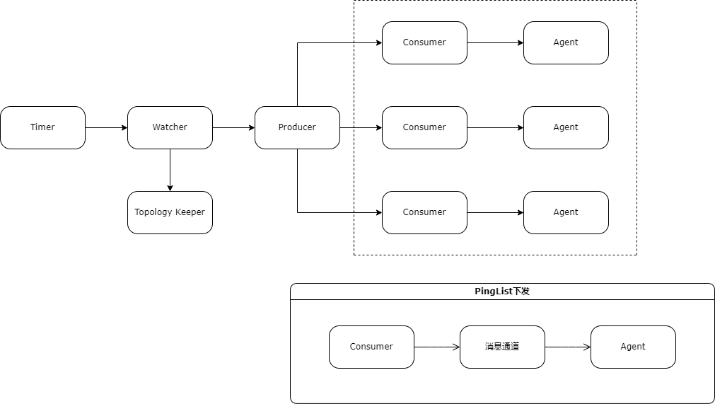3.1 AgentAgent是整个项目的数据采集器,负责接收来自控制器下发的PingList,PingList中有该Agent需要发出Ping目标的IP地址,最后将探测数据上报存储与分析模块。Agent要覆盖所有机房的绝大多数物理机,才能保证探测数据汇总后的有效性和真实性,所以,在Agent对PingList中的目标IP进行Ping操作时,Agent所占用的CPU资源不能超过5%,是Agent设计时要保证的核心要点。Agent由机房内部消息通道统一分发部署、更新、启动和停止。