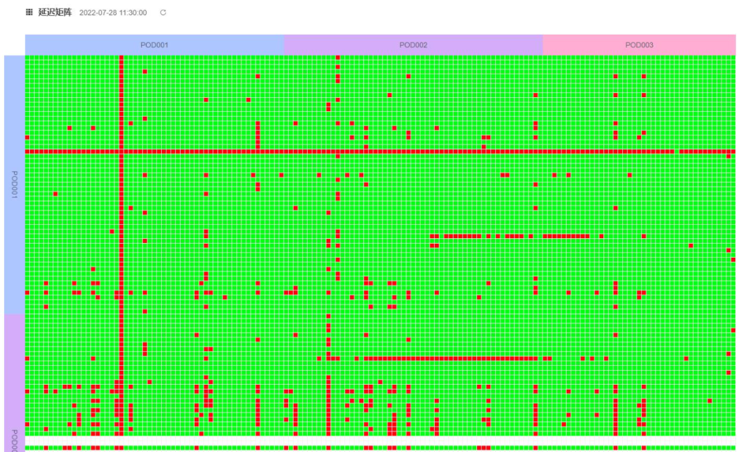 图4反应了同机房不同Pod(规划的一个网络区域)间的实时延迟分布信息,我们很快就能发现,其中一组ToR出现延迟问题,那么很有可能双向链路都会反应高延迟情况,同样也可能在丢包率的矩阵中反应出来。图中的每一个点都包含了一组ToR的数据,若以ToR为单位画点阵图,则会导致数据量过于庞大而无法使用。而实际使用中,完整的ToR粒度的矩阵图也不是必须的,所以如何选择汇聚维度成为一个问题。