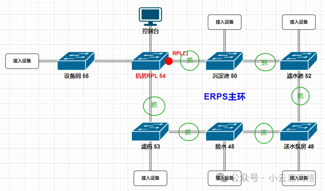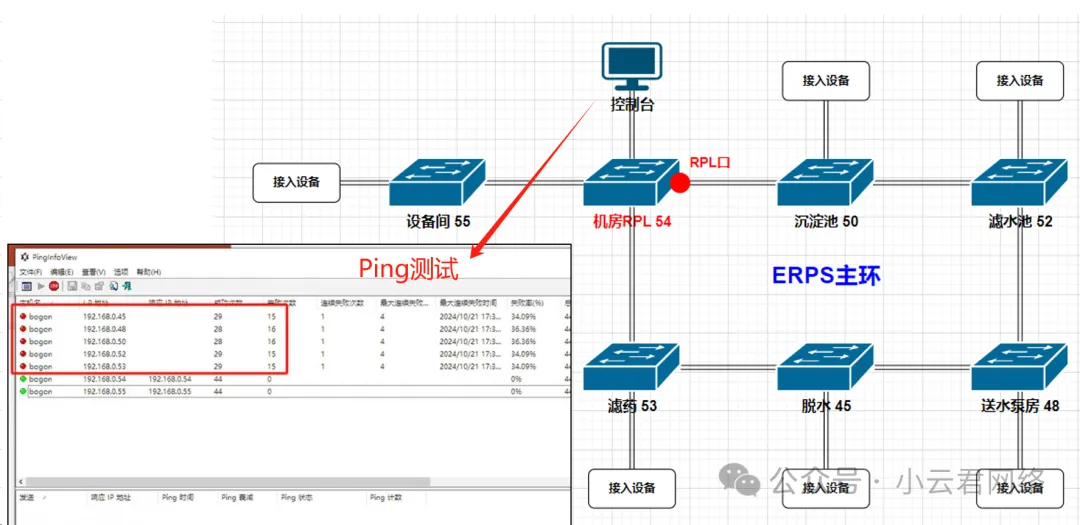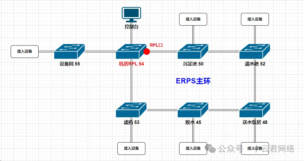 近期呢,有不少朋友咨询工业环网方案如何部署?如何维护?今天来给大家分享一个典型工业场景案例。项目地是一个自来水厂,工作人员发现每隔1-2个月,控制中心的控制台PC访问和ping工业终端存在大量丢包,而ping直连的交换机则无丢包。这个项目用的是某M的工业交换机部署的ERPS环网架构,组网拓扑如下: