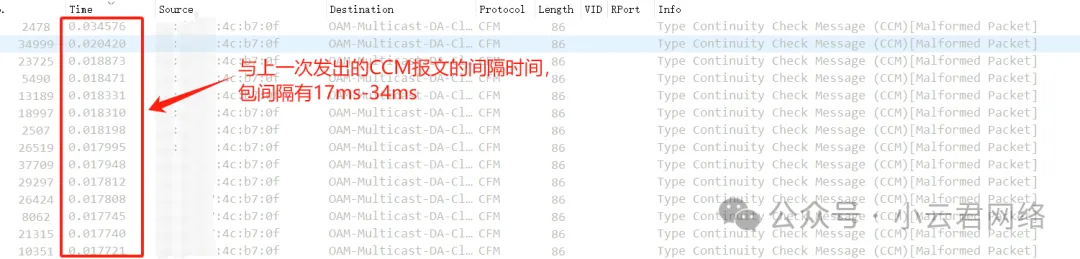 我们找到了环网检测包CCM发包异常的交换机是“送水泵房48”,通过wireshark分析过滤,有很多时候它的CCM检测发包间隔能打到17-34ms,这是完全不符合预期的: