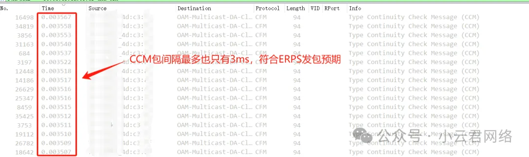 我们看看正常的交换机“沉淀池 50”,基本上CCM发包间隔最多只有3ms,完全符合ERPS环网检测预期: