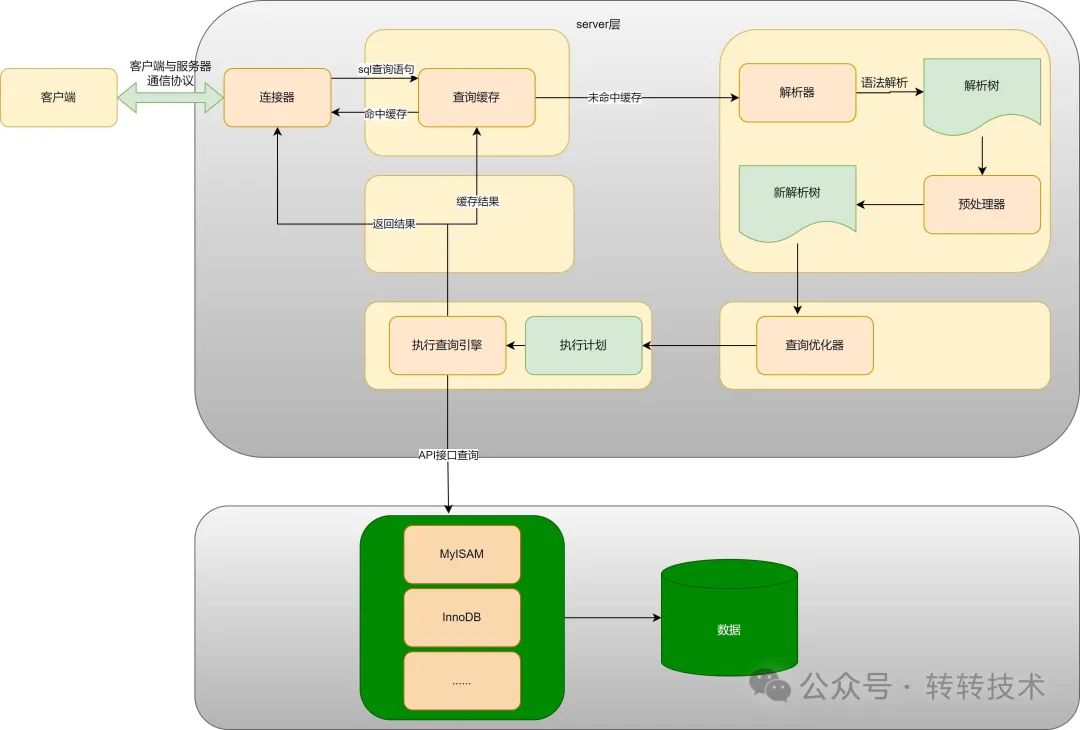 在查询解析和优化之后,服务层负责将 SQL 语句执行。服务层会将解析后的查询计划传递给存储引擎层,存储引擎负责实际的数据操作。