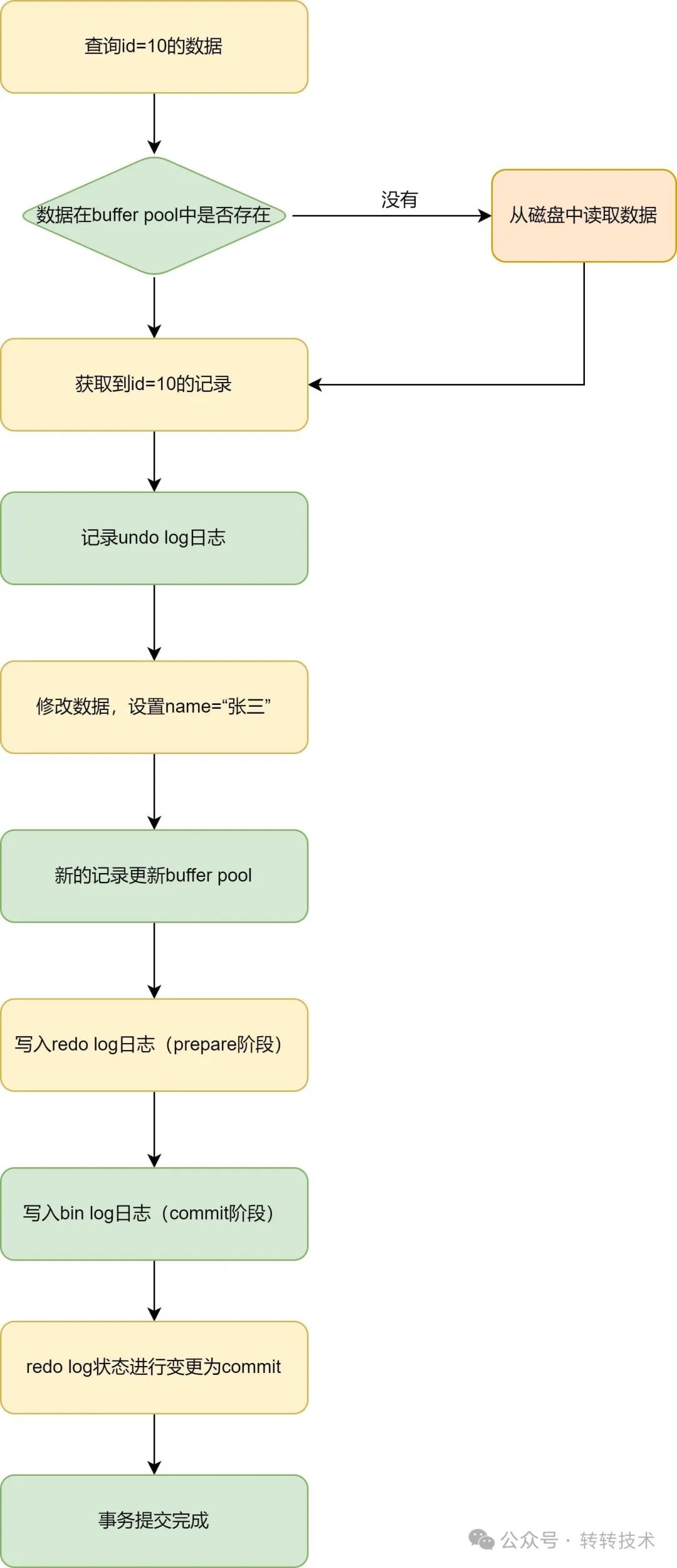 找存储引擎取到 id = 10 这一行记录。根据主键索引树找到这一行,如果 id = 10 这一行所在的数据页本来就在内存池(Buffer Pool)中,就直接返回给执行器;否则,需要先从磁盘读入内存池,然后再返回。记录Undo Log日志,对数据进行备份,便于回滚。拿到存储引擎返回的行记录,把 name 字段设置为 “张三”,得到一行新的记录,然后再调用存储引擎的接口写入这行新记录。将这行新数据更新到内存中,同时将这个更新操作记录到 Redo Log 里面,为 Redo Log 中的事务打上 prepare 标识。然后告知执行器执行完成了,随时可以提交事务。生成这个操作的 Binlog,并把 Binlog 写入磁盘。提交事务。把刚刚写入的 Redo Log 状态改成提交(commit)状态,更新完成。