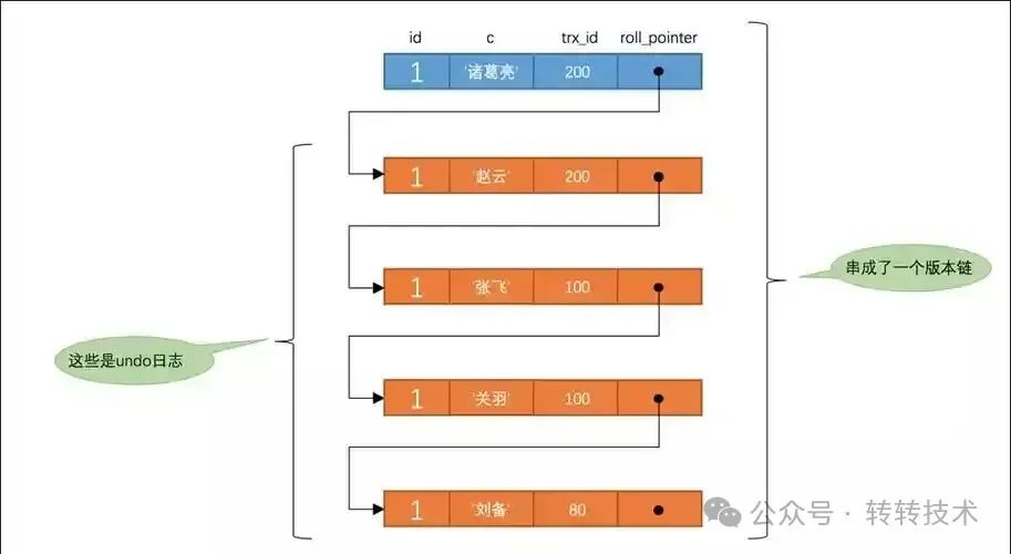 Undo Log 保存的是一个版本的链路,使用roll_pointer这个字段来连接的。多个事务的Undo Log 日志组成了一个版本链,如图:
