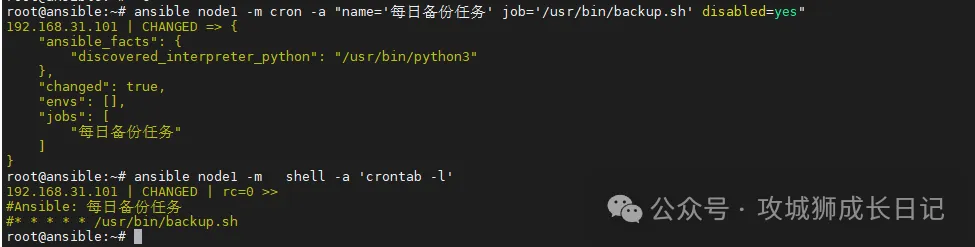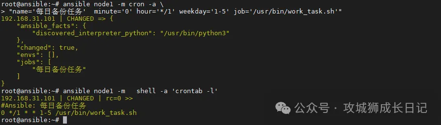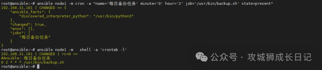 1. 创建一个定时任务这个示例将帮助你在目标主机上设置一个定时任务,该任务会在每天凌晨2点自动运行 /usr/bin/backup.sh 脚本。你可以选择使用 ansible-playbook 或者 ad-hoc 的方式来完成这个设置。