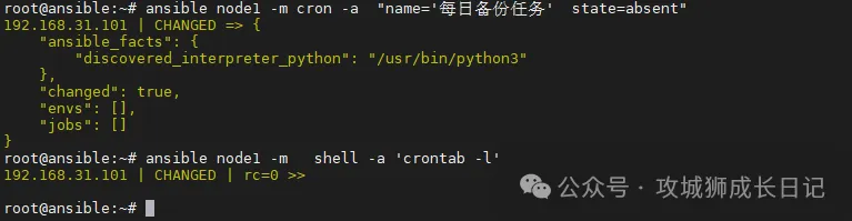 通过设置state为absent,可以删除指定的定时任务。执行如下命令: