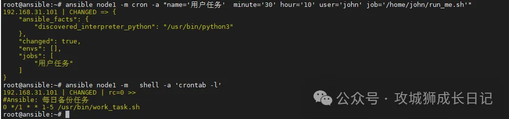 创建新的定时任务。修改现有任务。删除任务。通过cron模块,可以轻松实现对目标主机crontab的自动化管理,而无需手动登录服务器进行配置。