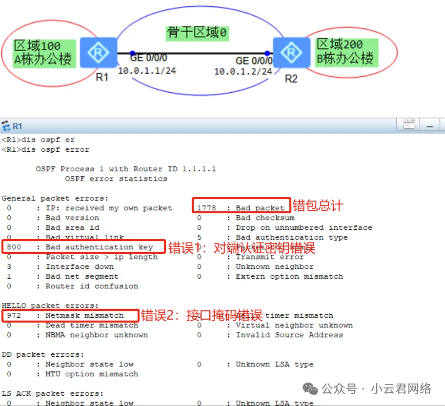 错误原因1:对端发的Hello包中认证密钥与本端不一致,这个通过密文的配置信息看不出来的;错误原因2:对端发来的Hello中接口掩码与本段不一致,这个在上述中通过配置信息已经明确。