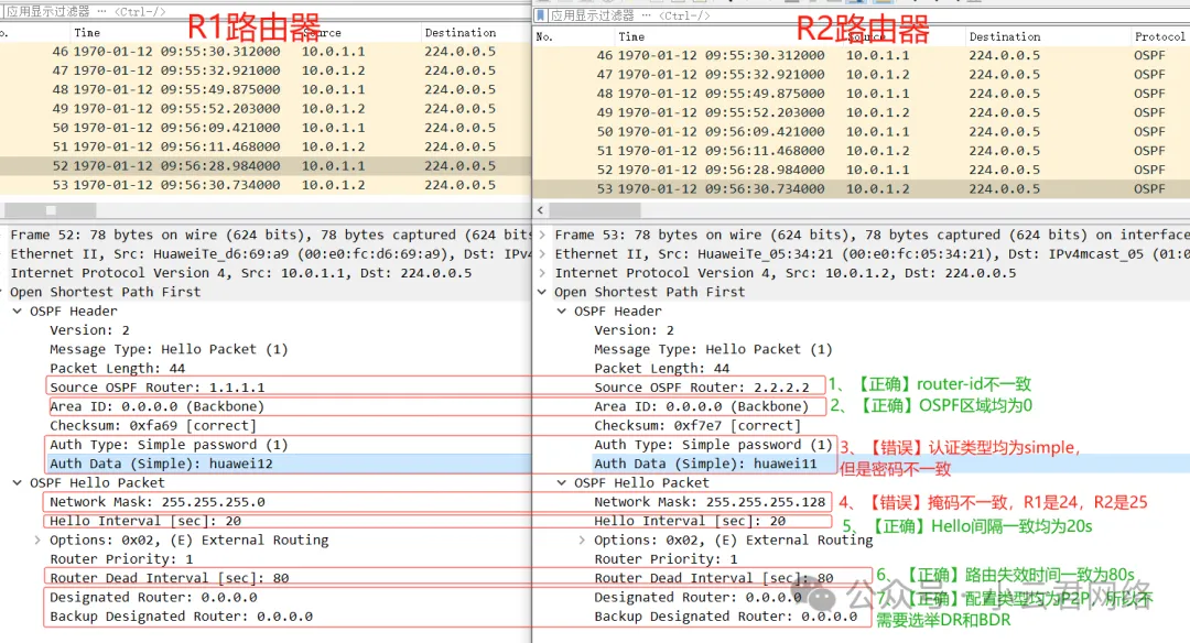 很显性的就能看到“掩码不一致”和“认证密码不一致”两处错误,这种方法适用于任何设备和场景,不依赖于设备诊断工具,我个人比较倾向该方法,同时还可以进一步学习协议。