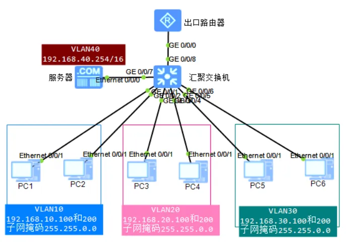 2. 网络拓扑服务器和PC1-PC6按照上图VLAN的IP规划配置即可,配置简单,此处省略,