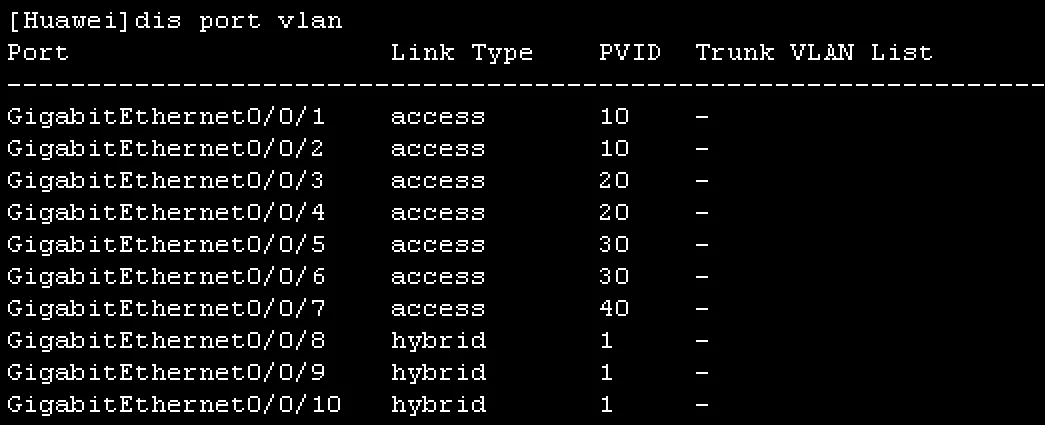 [Huawei-GigabitEthernet0/0/7]port default vlan 40
