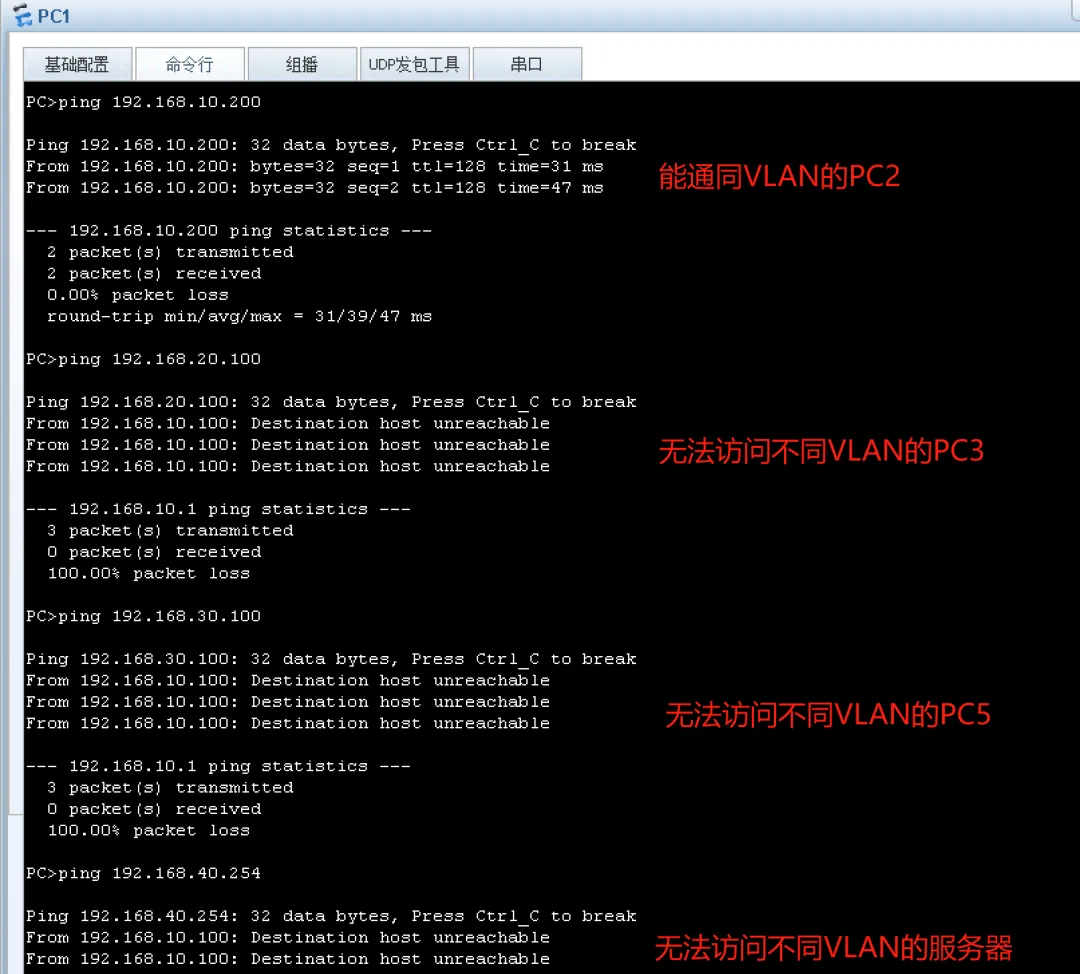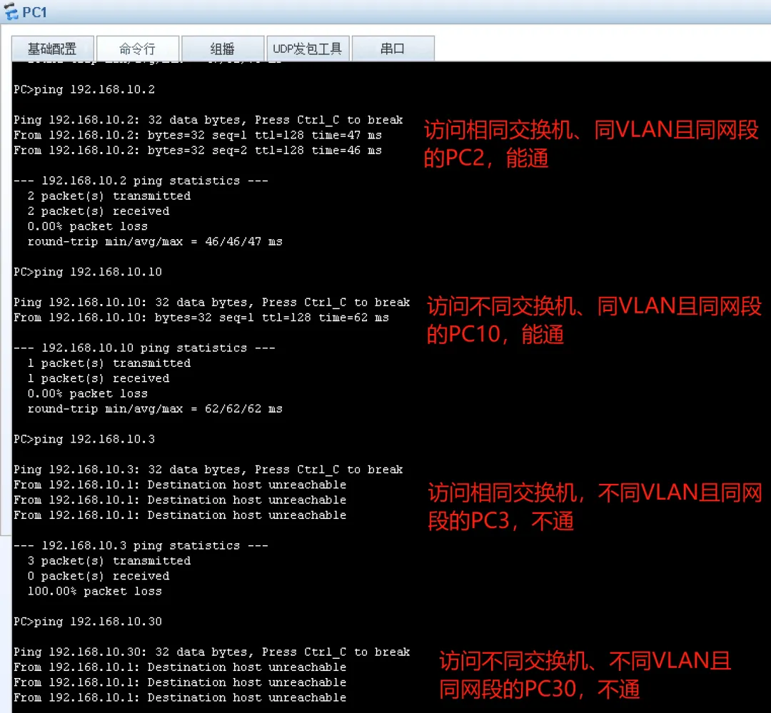 测试PC1 ping PC2、PC10、PC3和PC30;