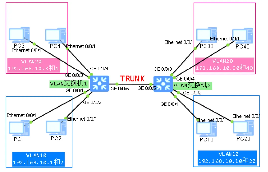 1. 背景介绍VLAN可以实现跨设备的同VLAN间互访不通VLAN的隔离。某些场景,用户办公分布在两个地方,所有终端网段都是192.168.10.0/24,但需要通过两台交换机连接来实现同一VLAN局域网的互访及不同VLAN的隔离。