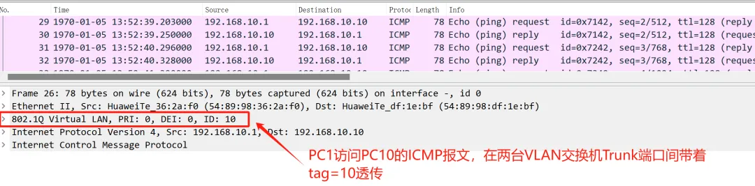 VLAN交换机1和2的互联Trunk端口之间透传的Ping报文如下: