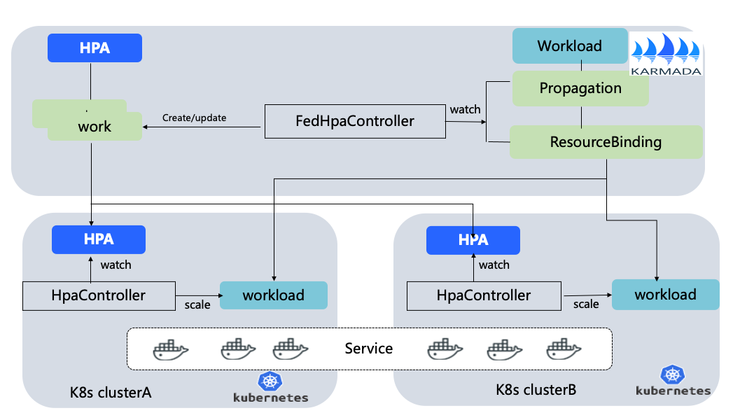 跨集群HPA这里定义为FedHPA,使用了K8s原生的HPA,在Karmada控制平面通过FedHpaController实现跨集群的弹性调度扩缩容。