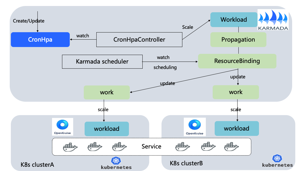 定时扩缩容是指应在固定时间点执行应用扩容来应对流量的高峰期。K8s本身没有这个概念,这里在Karmada控制平面定义了CronHpa资源,并通过Karmada-scheduler对多集群统一调度。避免非联邦化集群在多个member集群创建多个cronhpa。定时功能通过go-cron库实现。