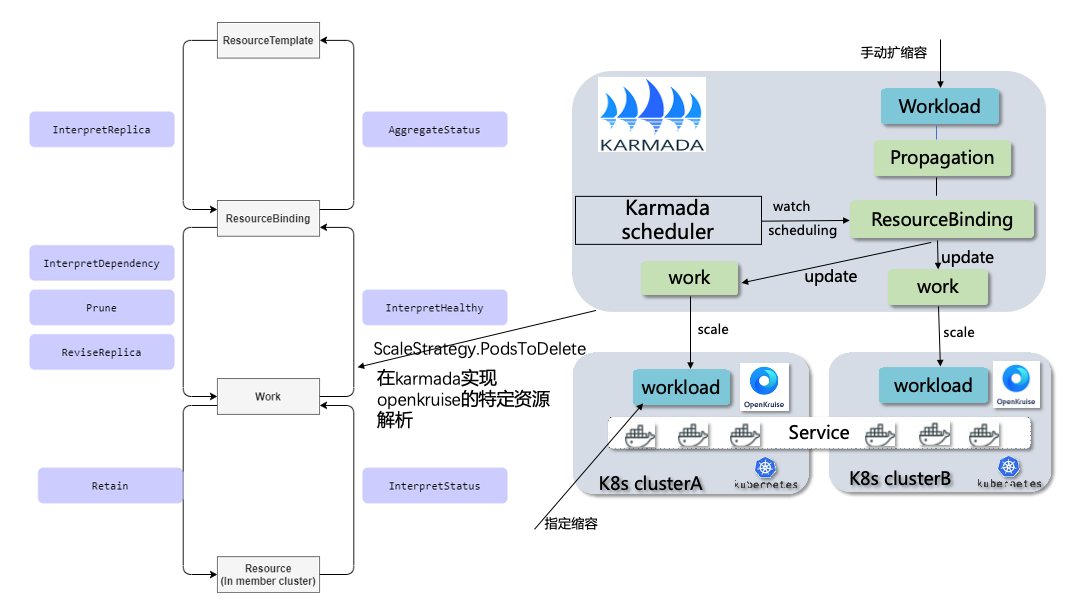 ScaleStrategy.PodsToDelete指定pod。需要在Karmada实现openkurise实现该字段的资源解析,不让它被控制平面覆盖。并在控制平面更新workload的副本和pp资源,保证副本数和调度结果一致。member集群的openkruise开始删除指定的pod。也可以尝试从Karmada控制平面指定删除pod和更改调度的结果,这样更加合理些,也不用添加Karmada资源解析。