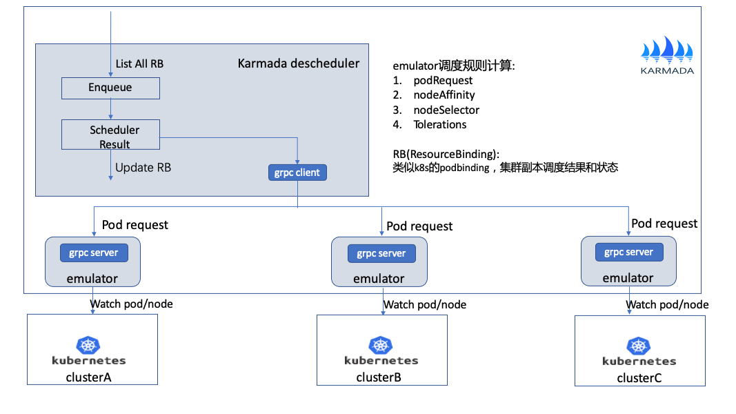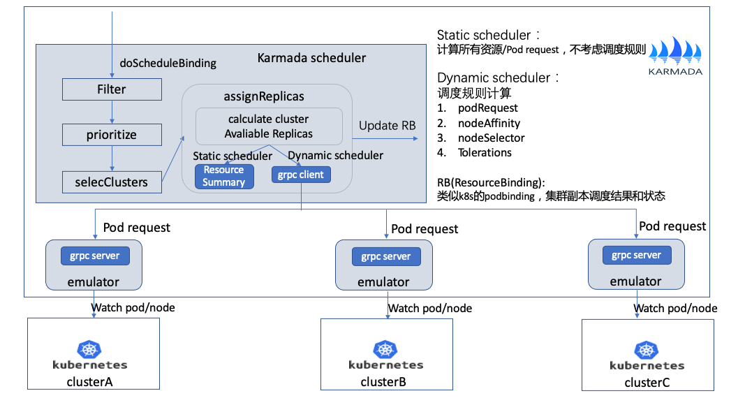 Karmada多集群调度主要实现跨集群资源的合理分配和集群故障快速迁移业务。如上图所示主要通过Karmada scheudler和emulator配合实现,其中emulator主要负责每个集群的资源的估算。