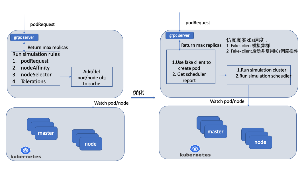 目前社区单集群的调度估算器,只是简单模拟了4种调度算法。和实际的调度算法有很大差距,目前线上有很多自研的调度算法和不同集群需要配置不同算法,这样估算器的精确度就会下降,导致调度出现pod pending的情况。可以对单集群的调度模拟器进行优化。