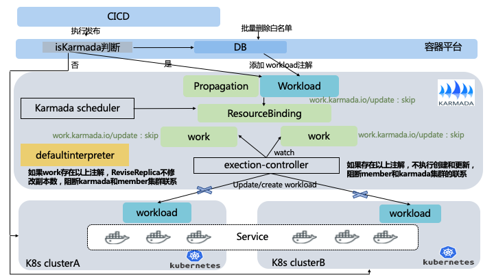 管理员通过容器平台,将需要迁移的应用插入迁移白名单。用户通过cicd发布,容器平台会进行发布接口调用。isKarmada模块会查看迁移名单,在白名单内将资源联邦化,接入Karmada管理。不在白名单内保持原有的静态集群管理。最终完成应用的发布,用户完全无感知。保持2种管理方式并行存在。3.4.2 应用回滚
