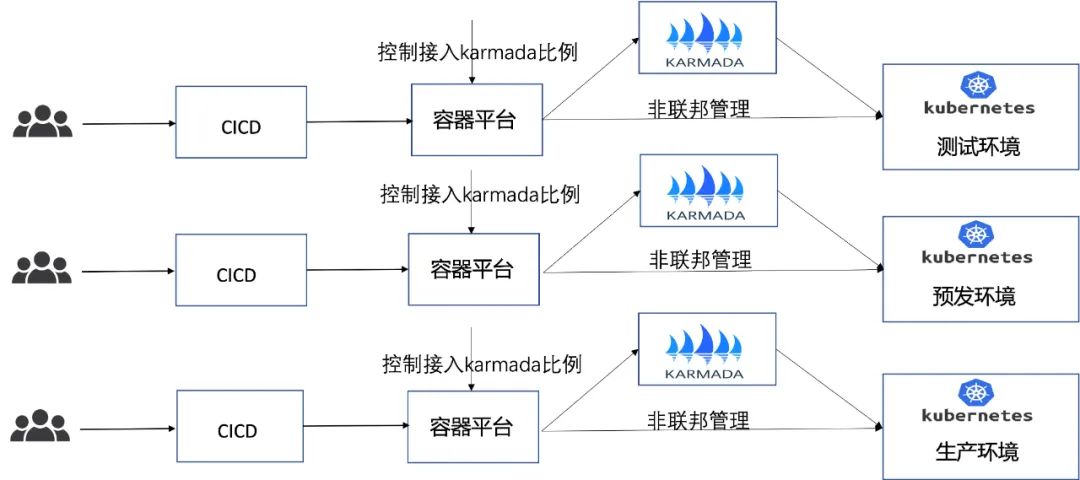 管理注册多个Kubernetes集群并接入Karmada,Karmada负责多个集群的资源调度编排和故障转移。容器平台统一管理K8s资源、Karmada策略和配置。CICD平台对应用进行单元测试、安全测试、编译镜像等操作,配置应用的存储、密钥、环境变量、网络和资源等,最终对接容器平台的API生成K8s对象,统一交付。图片