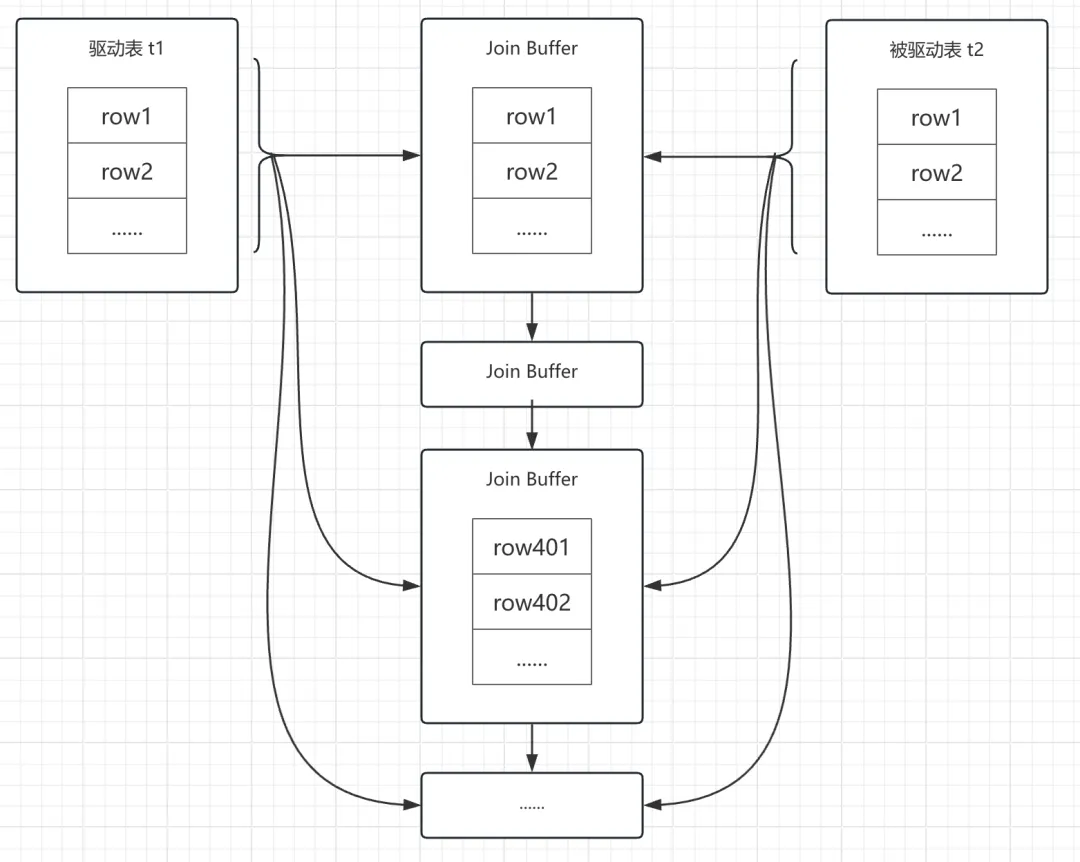 Join Buffer 的大小由参数 join_buffer_size 控制,默认为256K。在使用Join Buffer时,如果无法一次性存放所有结果集,他会分多次进行,比如: