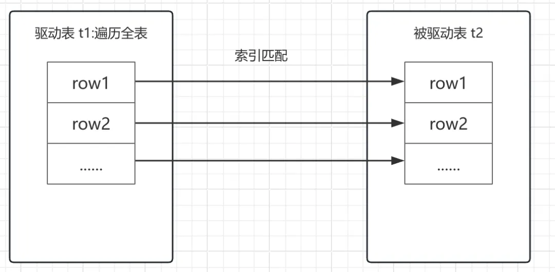 从上面的伪代码中,我们可以看到,其就是简单粗暴的嵌套循环,我们将其称为 Simple Nested-Loop Join。回到数据库层面,在测试SQL两个表关联的过程中,t1表中的每一行数据,都会触发扫描一次t2表的数据,然后进行数据匹配。总的来讲就是,因为t1表有1000行数据,所以t2表会被扫描1000次,并进行1000 * 10w = 1亿次数据比较。