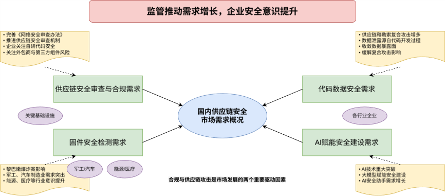 在国内,供应链安全市场增长主要是受供应链安全态势升级、政策监管与合规压力、地缘政治与技术封锁等因素影响。整体上,市场需求表现有以下几个方面: