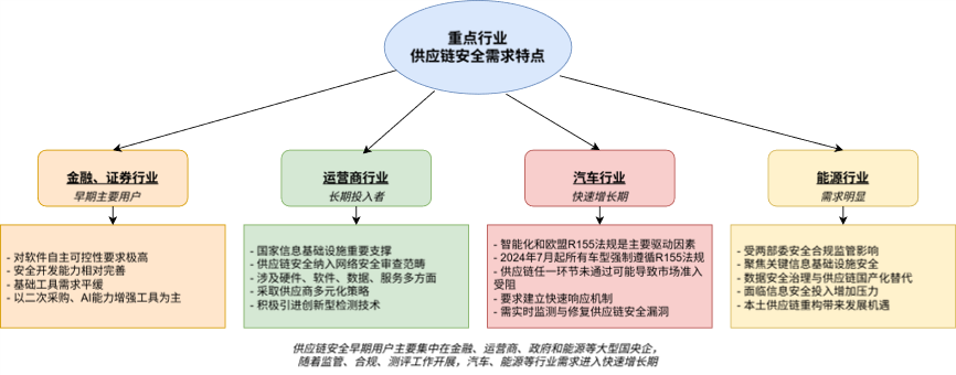 从行业需求来看,供应链安全的用户早期主要集中在金融、运营商、政府和能源等行业大型国央企。随着监管、供应链合规、测评检测工作的开展,汽车、能源等行业的供应链安全需求逐渐进入了快速增长期。当前,不同行业供应链安全监管力度、建设进度各不相同,需求差异也较明显。
